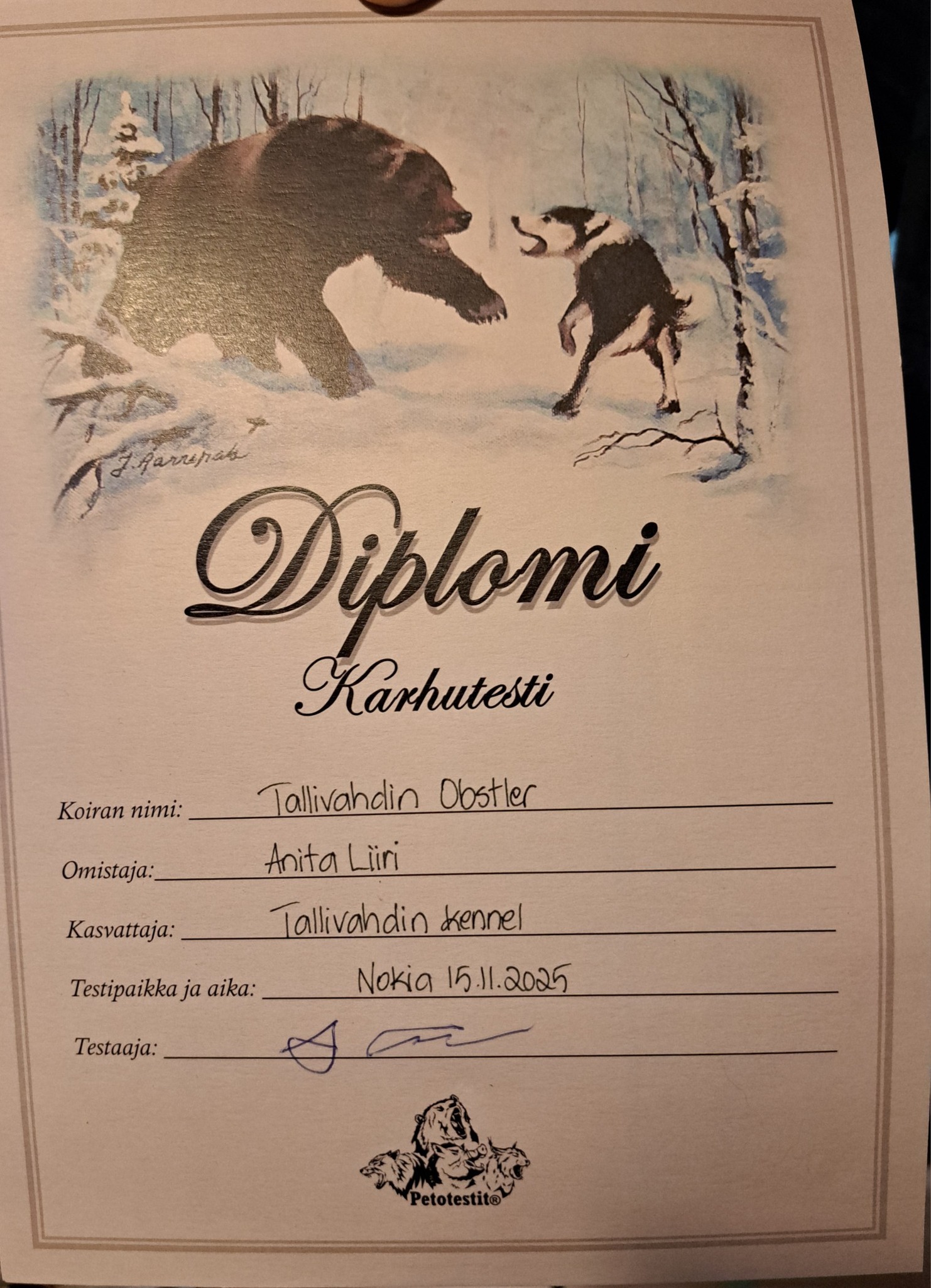 | 17.11.2025 KARHUTESTIUUTINEN: Toivo 6 v, eli Tallivahdin Obstler, oli 15.11.25 karhutestissä. Toivo oli hyvin tilanteen päällä ja potrana vartioi, mutta ei se pöljä ole ja syötä itseään karhulle - HYVIN VARTIOITU TOIVO!!!😍👍🐻 |