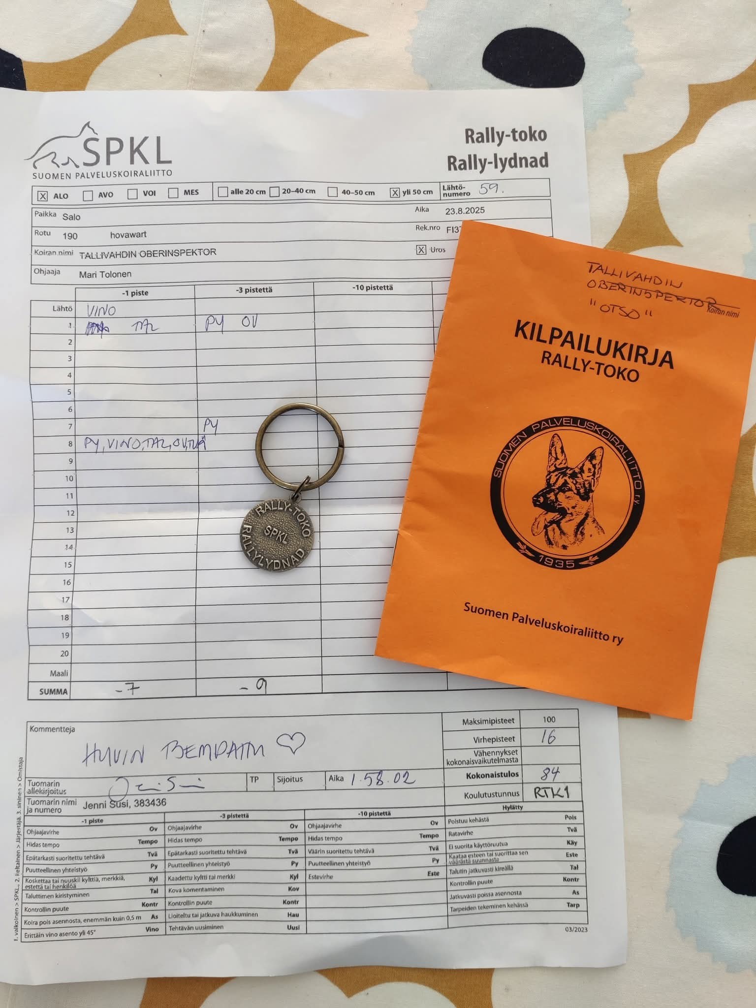 | 23.08.2025 RALLY-TOKO-UUTINEN Turun Otso, JK1 FCI-BH Tallivahdin Oberinspektor ansaitsi tänään RTK1 koulutustunnuksen 84 pisteellä - PALJON ONNEA! |