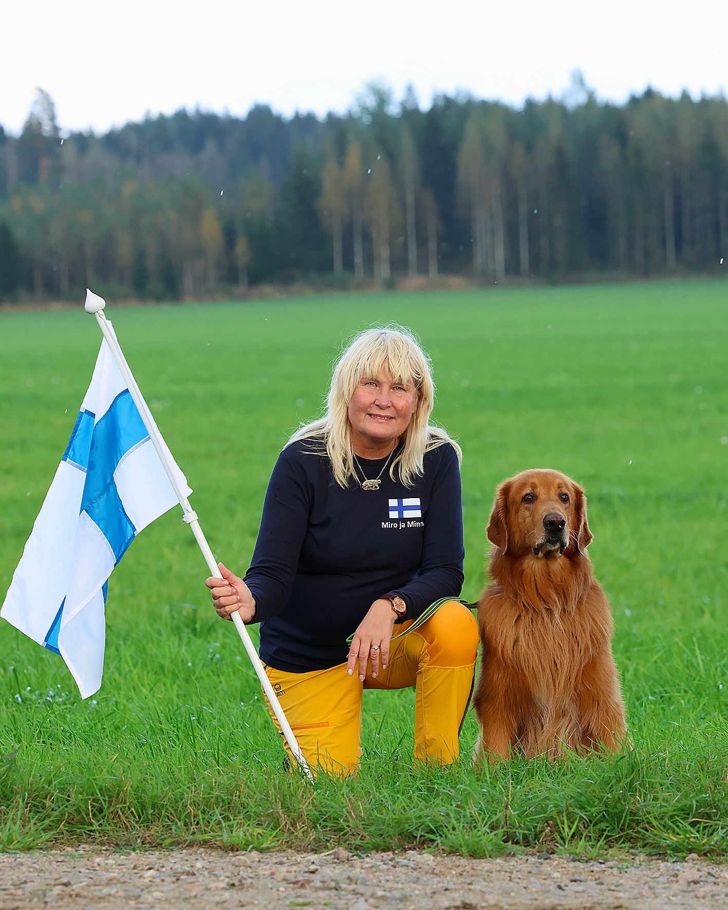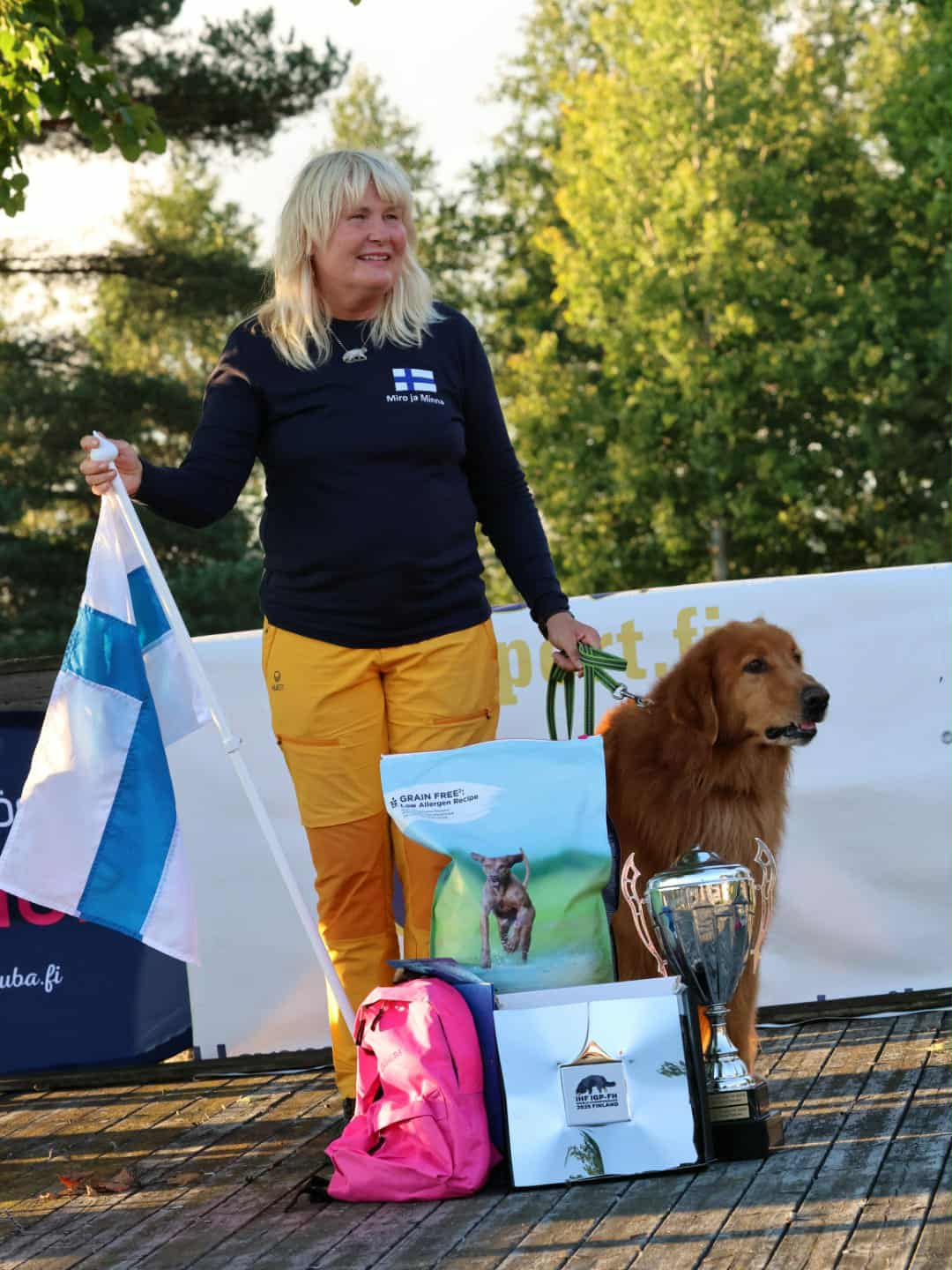 MIRO ON ROTUMME FCI-IGP-FH MAAILMANMESTARI!!! Olipas aikamoinen seikkailu rotumme erikoisjäljen MM-kokeessa 10.-13.9.25, joka järjestettiin ensimmäistä kertaa Suomessa. Kokeeseen osallistui 12 hovawartia 6 eri maasta: 1 ruotsalainen, 2 saksalaista, 2 slovakialaista, 2 tsekkiläistä, 2 unkarilaista ja 3 suomalaista. Tunnelma oli käsinkosketeltavan jännittävä jo keskiviikkoiltana Hotelli Hanhen pihalla Lapinjärvellä, kun ensin ilmoittauduttiin, tarkistettiin rokotukset ja koirat ja lopuksi vielä mitattiin, että liinat ovat minimissään 10 metrin mittaisia. Sen jälkeen oli avajaiset Hotellin ravintolassa. Avajaisissa osallistujat arvottiin kahteen kilpailuryhmään punaiset ja keltaiset ja näissä ryhmissä sitten suorittaisimme jäljet. Meikäläinen oli keltaisessa ryhmässä, joka ensimmäisenä kisapäivänä suoritti iltapäivällä. Jäljet arvottiin sitten vasta lähempänä suorituksia ja niinhän siinä sitten kävi, että saimme Miron kanssa koko päivän viimeisen jäljen, joten suorituksemme alkoi klo 17.00. Miro oli lähdössä normaali ensimmäiset viisi metriä, mutta sitten se yhtäkkiä teki ison ympyrän ja mulkoili meikäläistä siinä kävellessään ja emännän veri kyllä seisahtui. Onneksi Miro päätti sitten itsenäisesti jatkaa suoritusta ja jäljesti koko loppujäljen varsin normaalisti. Tuuli oli kova ja ruoho kohtalaisen pitkää, jolloin koiran piti osata pitää kuono koko ajan maan pinnan lähellä ruohon seassa, jotta se ei olisi kadottanut jälkeä. Harmittavasti Miro jätti peltoon kaksi esinettä, eikä merkannut niitä lainkaan. Ne olivat saman suoran jälkimmäisiä esineitä, eli suorien ensimmäiset esineet se ilmaisi normaalisti, mutta ei tosiaan noteerannut suorien toisia esineitä. Pitääpä jatkossa laittaa useampia esineitä samalle suoralle, jotta Miro lopettaa niiden laskemisen... Tuomari Outi Hermiö kehui Miron vastatuulityöskentelyä päivän parhaaksi ja olin todella iloinen Miron työskentelystä. Ensimmäisen koesuorituksemme pisteet olivat 82 ja olimme niillä sijalla kolme. Kisapäivien välillä oli yksi vapaapäivä, jolloin seikkailimme kultapoikien kanssa mm. luontopolulla. Toisen päivän koejäljet olivat samoilla pelloilla kuin ensimmäisenä päivänä, mutta jälkiryhmät vaihtoivat peltoja ja aikatauluja päittäin, eli meidän jälkivuoromme alkoi aamulla ja Miro sai jäljen nro 3, jonka aloitusaika oli klo 11.00. Toisena päivänä tuomarina oli virolainen Aivo Oblikas. Nyt Miron alku ja ensimmäinen suora oli varsin normaali, mutta kolmessa ensimmäisessä kulmassa se teki tarkistuspyörähdyksen ja niinpä meikäläinen sai taas vähän ekstrajännitettävää. Jälkemme ensimmäinen puolikas sujui heikommin kuin jälkimmäinen puolikas, jossa Miro työskenteli varmasti ja halukkaasti. Nyt se ilmaisi kaikki 7 esinettäkin, joista saimme pisteitä erittäin hyvästä erinomaiseen: kannatti selvästi vaihtaa ilmaisu talvella makaamisesta seisomiseen, sillä nyt ilmaisuista tuli vain muutama pistemenetys. Miro sai loppupisteet 87 ja me nousimme kisan kärkeen. Siinä sitten ehdin jännittää vielä 9 koiran suoritukset, ennen kuin koe päättyi. Tsekkiläinen koirakko sai samat pisteet kuin me 169 p/200, mutta Miron yhden jäljen pisteet olivat paremmat ja näin meistä tuli rotumme erikoisjäljen maailmanmestareita! Kisatunnelma oli avoin, mukava ja rento alusta loppuun asti ja kokeen päättymisen iltajuhlaan osallistui noin 50 ihmistä. Miro on ihan mahtavan tulosvarma koira, joten osasin odottaa tulosta, sehän teki ensimmäisen IGP-FH-tuloksensa 165 p 4-vuotiaana vuonna 2021 rotumme MM-kokeessa Saksassa ja silloin olimme kokeen viidensiä. Tämä koe oli ilman muuta yksi harrastusurani huippuhetkistä, jota tulen varmasti muistelemaan pitkään! ISO KIITOS KAIKILLE MEITÄ KANNUSTANEILLE JA ONNITELLEILLE - WE ARE THE CHAMPIONS OF THE WORLD