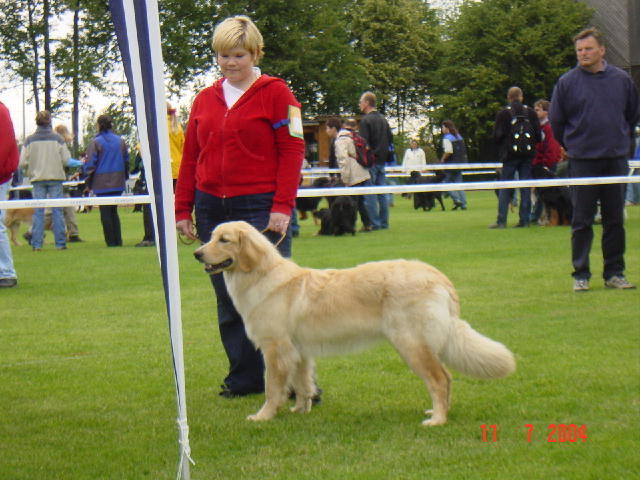 31.7.2004 ROP-pentu Pentuluokka 7-9 kk, Suomen hovawarttien päänäyttely, Tervakoski, tuomari Ursula Berges, Saksa. Busenfreundin-sisko sijoittui saman luokan 4:nneksi! Kylli sai ROP –pentuna oman esittelyn Hovawart lehteen 3/2004!