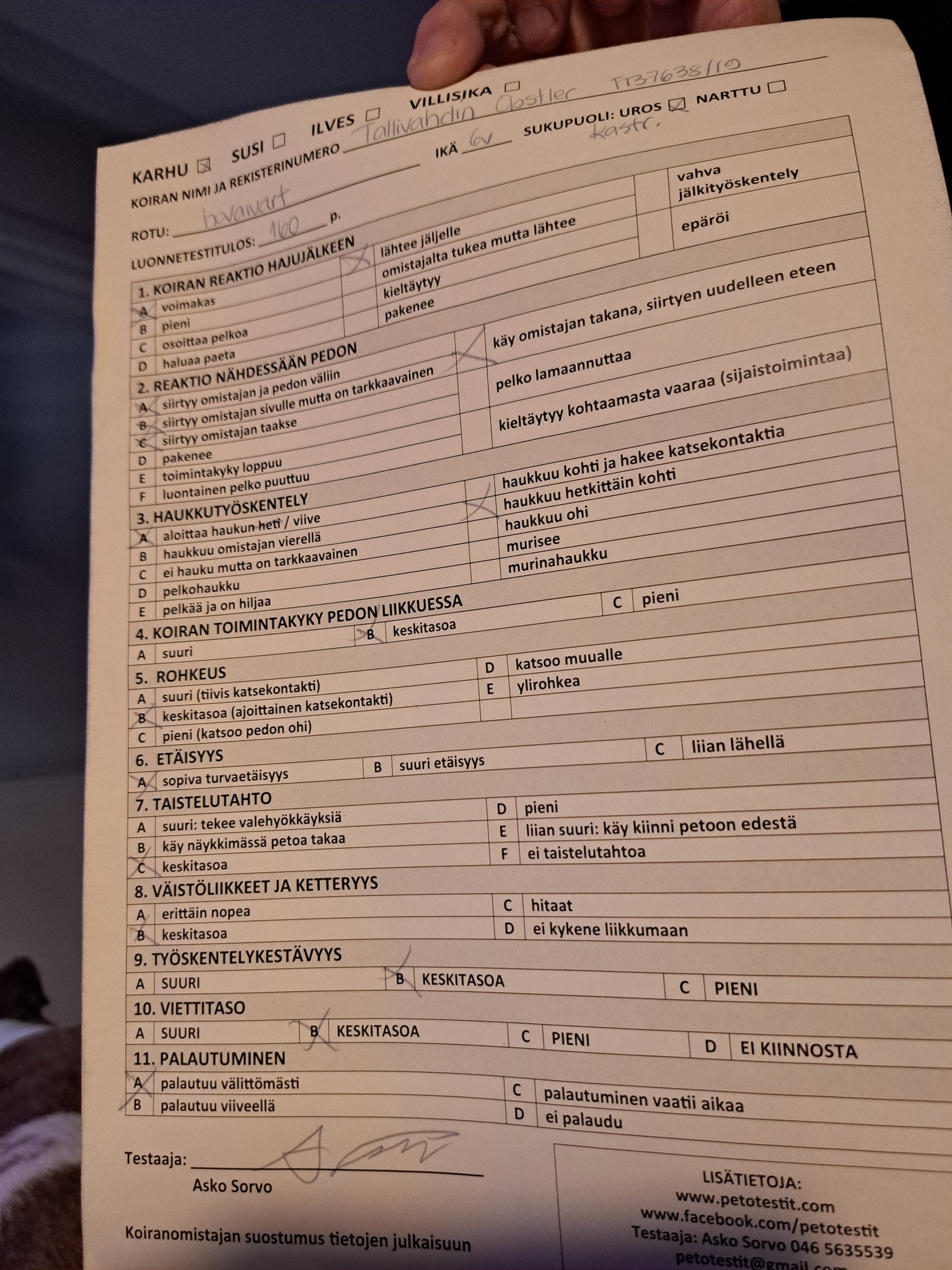 | 17.11.2025 KARHUTESTIUUTINEN: Toivo 6 v, eli Tallivahdin Obstler, oli 15.11.25 karhutestissä. Toivo oli hyvin tilanteen päällä ja potrana vartioi, mutta ei se pöljä ole ja syötä itseään karhulle - HYVIN VARTIOITU TOIVO!!!😍👍🐻 |