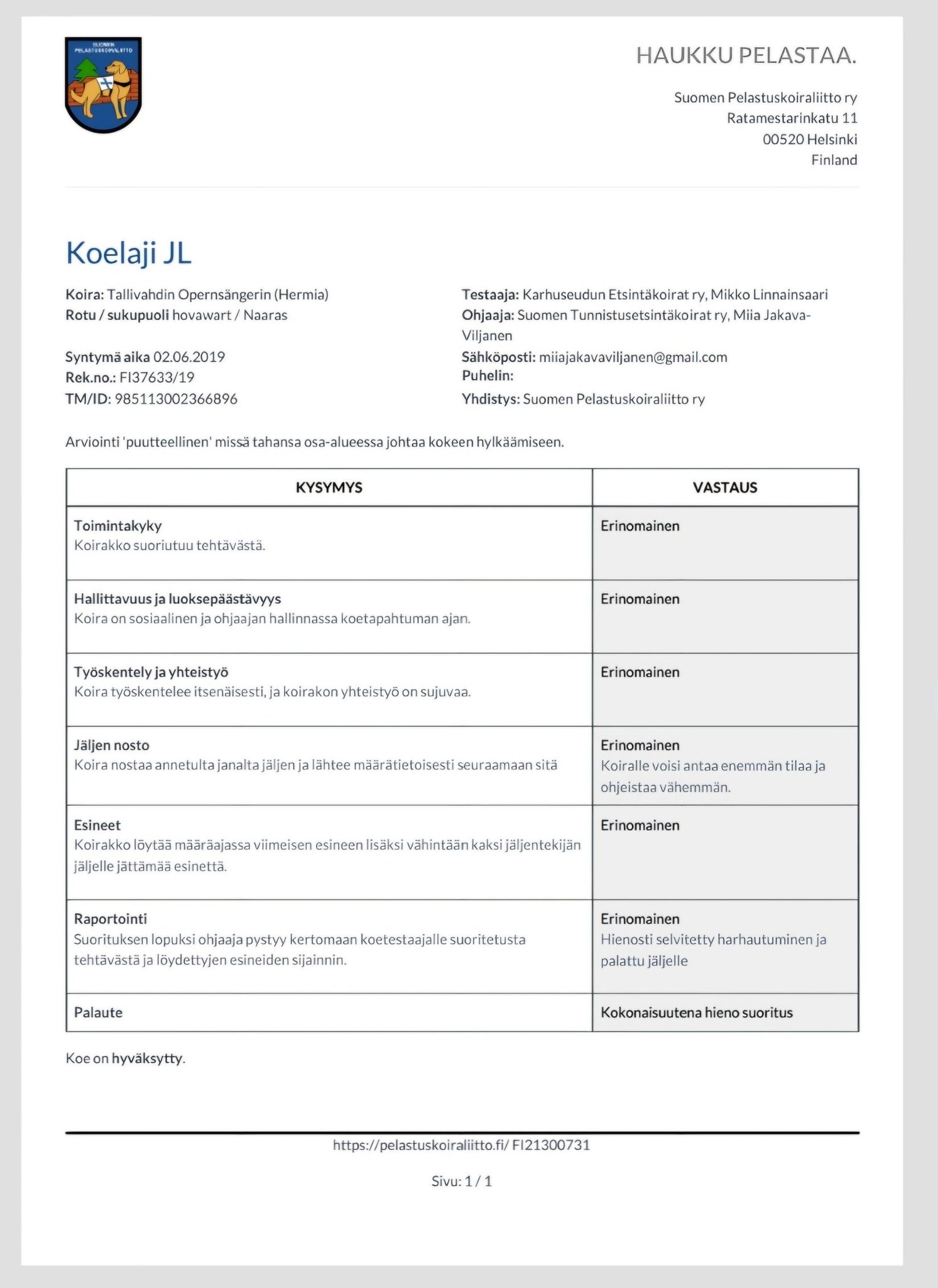 PELASTUSTULOS: Hermia 5 v, PEKO-T RH-F V FCI-BH Tallivahdin Opernsängerin, ja emäntänsä Miia Jakava-Viljanen suorittivat Pelastuskoiraliiton jäljen loppukokeen lauantain ja sunnuntain välisenä yönä erinomaisin arvosanoin. Kokeen järjestäjä oli KarSeE, eli Karhuseuran Etsintäkoirat ry Porista ja testaaja Mikko Linnainsaari. PALJON ONNEA MIIA&HERMIA UPEASTA YHTEISTYÖSTÄNNE JA TREENI-INTOA JATKOONKIN!!! Jälleen on uusi juhlan aihe viikon päästä kennelleirillämme!